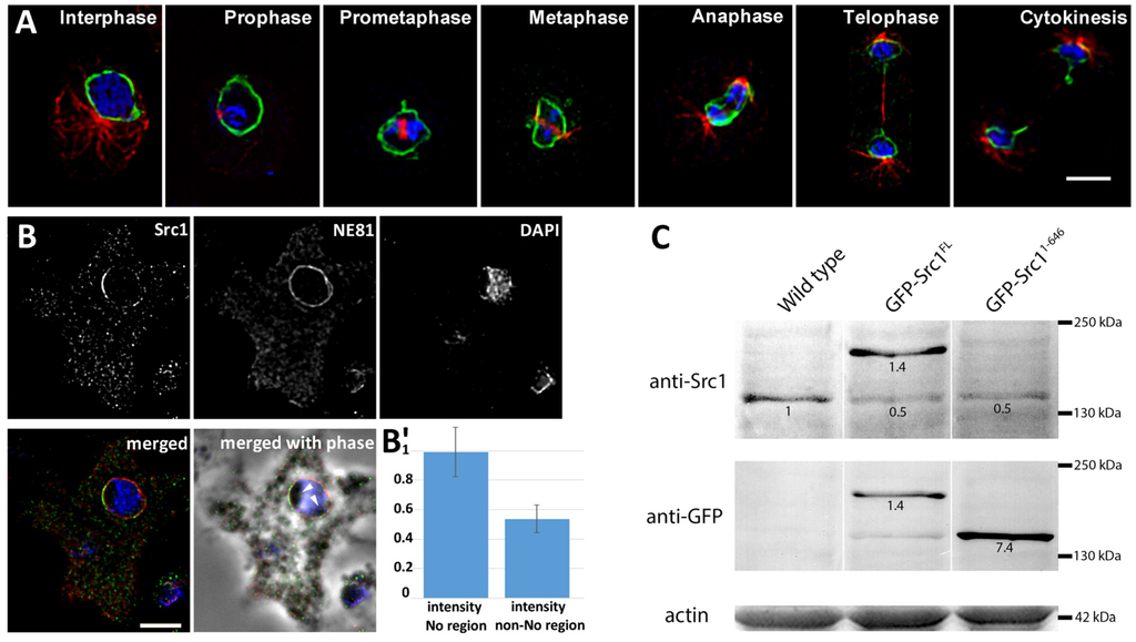 Distribution of Src1 at the nuclear envelope. (A) Localization of GFP-Src1 during interphase and mitosis. Mitotic stages are indicated. GFP fluorescence is shown in green, DAPI staining of nuclei in blue, and microtubules in red (labeled with anti-α-tubulin YL1/2 and anti-rat-AlexaFluor 561). Bar, 4 μm. (B) Localization of endogenous Src1 labeled with anti-Src1/anti-rabbit AlexaFluor 488 (green), anti-NE81/anti-AlexaFluor 568 (red), and DAPI (blue). Note the uneven distribution of Src1 with accumulations at sites of nucleolar attachment to the nuclear envelope. Nucleoli (arrowheads) are poorly stained with DAPI and visible in phase contrast images as dark structures within the nucleus. (A, B) widefield deconvolution microscopy. Specimens were fixed with glutaraldehyde. Maximum intensity projections of thin image stacks through the center of the nucleus are shown. Bar, 5 μm. (B') Quantitative evaluation of anti-Src1 staining intensities in nucleolar (No) vs. non-nucleolar (non-No) regions at the NE. Mean normalized staining intensities ± S.D. are shown (n = 60 for each region). (C) Western blot of cytosolic extracts of wild-type, GFP-Src1 full length, and GFP-Src11–646 cells stained with anti-Src1 antibodies and anti-GFP antibodies as indicated. Numbers refer to relative staining intensities, whereby Src1 staining in wild-type cells was set to 1. As protein levels of GFP-Src1 are the same whether stained with anti-Src1 or anti-GFP, the protein level of GFP- Src11–646 compared to endogenous Src1 could be deduced. Actin is shown as a loading control.