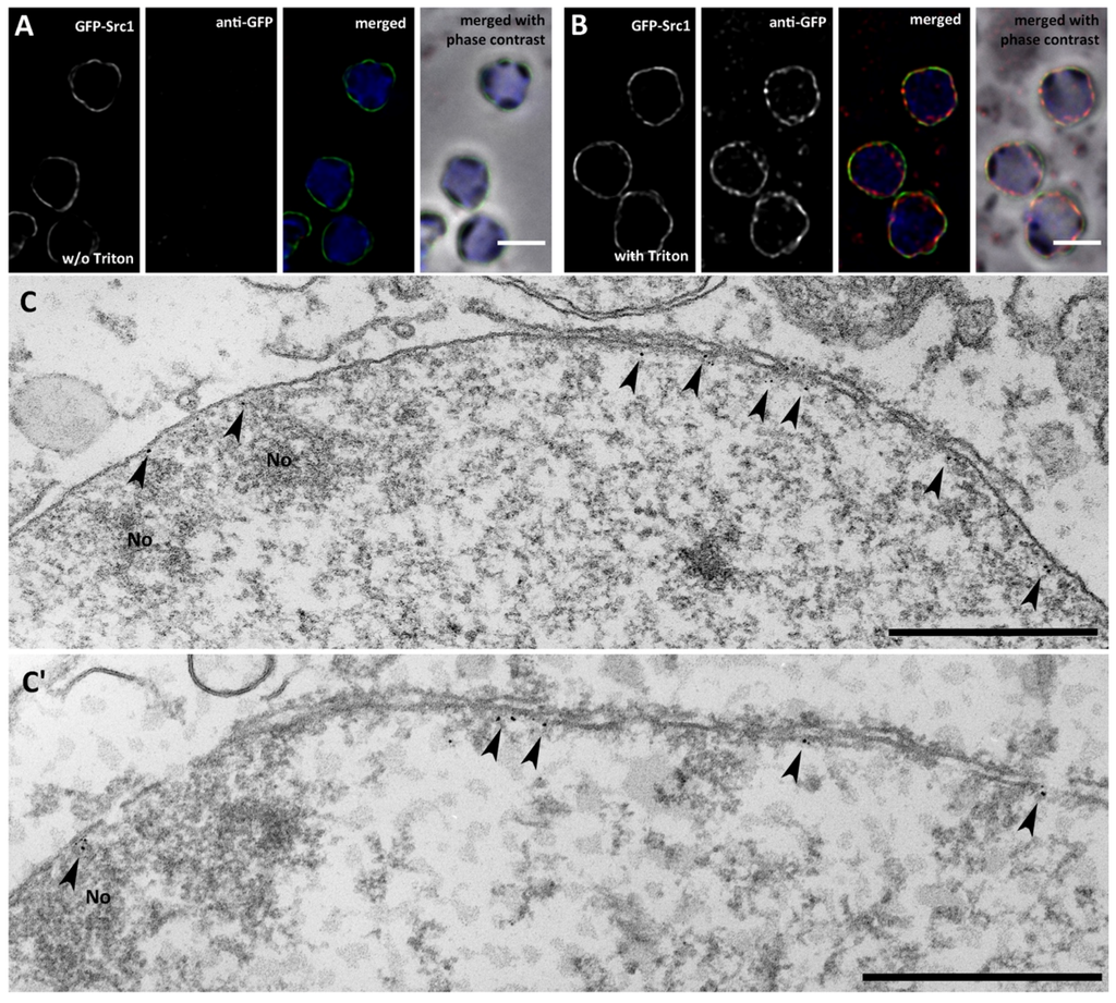 Next, we tested whether Src1 is an exclusive INM protein, and whether the N-terminus of this two transmembrane helix protein faces the nucleoplasm, as true for other Man1 orthologues [7,40], or projects into the perinuclear space. GFP-Src1 was stained with anti-GFP antibodies only if isolated nuclei were first permeabilized with Triton X-100, suggesting that GFP-Src1 is targeted exclusively to the inner nuclear membrane (Figure 3A,B). Although attempts to stain endogenous Src1 with our anti-Src1 antibodies in immuno-electron microscopy specimens failed, labeling of GFP-Src1 with anti-GFP antibodies decorated with gold-labeled Fab-fragments worked well. Gold particles were solely detected on the nucleoplasmic side of the INM indicating that the Src1 N-terminus is oriented towards the nucleoplasm (Figure 3C). The existence of two predicted transmembrane domains implies that this holds true also for the C-terminus. Taken together, we present strong evidence that Src1 is an inner nuclear membrane protein with both its amino- and carboxy-termini oriented towards the nucleoplasm. In agreement with GFP-Src1 distribution in fluorescence microscopy we found no bias in the distribution of gold particles at the NE towards nucleoli (Figure 3C,C').