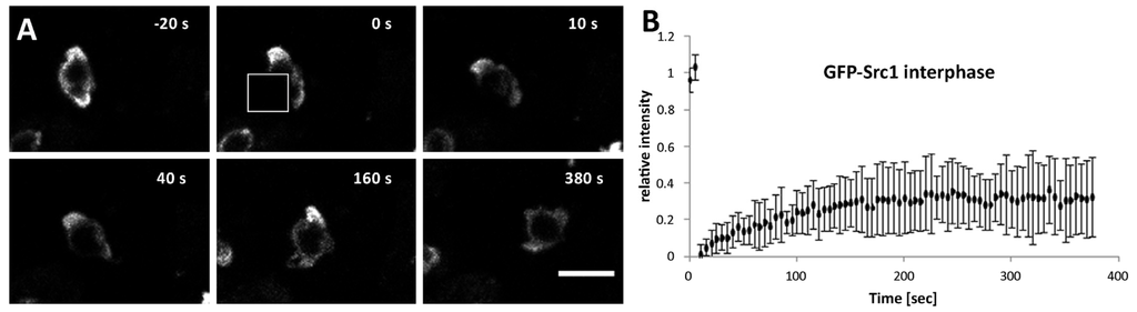 GFP-Src1 exhibits low mobility in FRAP experiments. (A) Selected time points of supplemental movie 2 are shown. The bleached region is indicated by a white square. Bar, 5 μm. (B) FRAP curve showing mean values ± S.D. after normalization and background correction (n = 8).