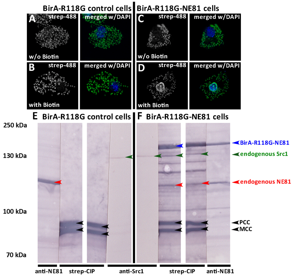 BirA-R118G-NE81 biotinylates itself and Src1. (A-D) Fluorescence microscopy of glutaraldehyde fixed BirA-R118G control cells (A, B) and BirA-R118G-NE81 cells (C, D) stained with streptavidin-AlexaFluor 488 (green) and DAPI (blue). Cells were cultivated with (B, D) or without (A, C) addition of biotin to the medium as indicated. Note the biotin-labeling of the nuclear envelope in (D). Mitochondria are stained as well due to the presence of constitutively biotinylated proteins [19]. Bar, 5 μm. (E, F) Western blot of nuclear extracts from BirA-R118G control cells. Positions of marker proteins are given on the left. (E) and BirA-R118G-NE81 cells (F) stained with anti-NE81/anti-rabbit-CIP, streptavidin-CIP and anti-Src1/anti-rabbit-CIP. Color detection was performed with nitroblue tetrazolium chloride (NBT) and bromo-chloro-indolyl-phosphate (BCIP). Blot lanes were split in two halves, stained individually as indicated and re-aligned after staining as shown. Positions of BirA-R118G-NE81 (blue arrowhead), Src1 (green arrowhead) and NE81 (red arrowhead) are shown. Black arrowheads indicate positions of known constitutively biotinylated mitochondrial proteins [19]. Src1 and NE81 are only biotinylated in BirA-R118G-NE81 cells, but not in control cells. BirA-NE81 also biotinylates itself [19].