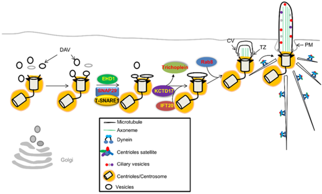 After distal appendage formation has been completed, these complexes interact with a post-Golgi vesicle on the mother centriole to form a ciliary vesicle. It has been reported that the small GTPase, Rab8a and its GEF, Rabin8, have an important role in ciliary vesicle formation and extension [58]. GTP-bound Rab11 interacts with Rab8 to regulate vesicle transport from the trans-Golgi network and recycling endosomes during ciliary assembly [10,58,59]. In addition, Rab8 interacts with the TRAPPII to form complexes that regulate intra-Golgi transport through vesicle tethering [59]. Ahi1 (or Jouberin), which is mutated in Joubert syndrome, regulates the recruitment of Rab8a to the basal body [60,61]. In exocytosis, sequential activation of the small G-proteins, Rab11 and Rab8a, has been well documented [62]. Once activated this complex recruits Sec15 and myosin, a component of the exocyst vesicle and the actin motor protein, respectively. These facilitate tethering and transport during early stages of cilia assembly [62,63,64]. During the developmental stage of outer photoreceptor cells, it is believed that Rab8 conjugates with the specific SNARE proteins, syntaxin 3 and SNAP-25 to promote expansion of the ciliary membrane by vesicular fusion [65]. Recently, membrane shaping proteins EHD1 and EHD3, in association with the Rab-11-Rab8 cascade, have been found to be required for early vesicle-mediated ciliary assembly at the distal appendages [53]. Finally, several accessary structures are formed subsequent to basal body differentiation and docking, such as the transition zone, rootlets and basal feet that provide structural support to the cilium [66]. These data suggest that centriole-to-membrane docking mediated by distal appendage proteins may serve as an instructive signal that temporally and spatially regulates cilia initiation.