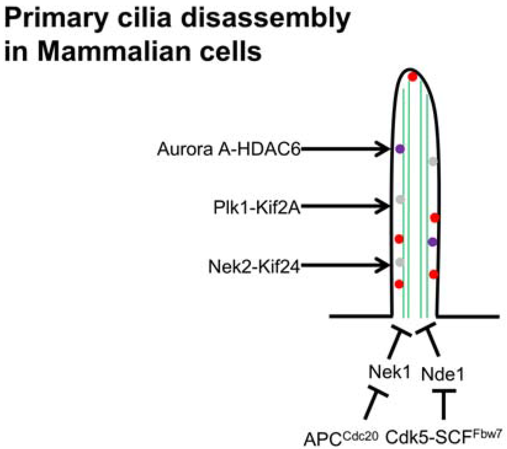 The Anaphase Promoting Complex (APC), a key E3 ubiquitin ligase required at the onset of anaphase, localizes to the basal body and has an important role in regulating ciliary polarity [127]. Kirschner and co-workers found that after serum stimulation, the activity of APCcdc20 is required for proper maintenance of ciliary length as well as for the timely resorption of cilium [128]. They have demonstrated that APCcdc20 regulates the stability of axonemal microtubules through targeting Nek1 (Figure 2) for ubiquitin-mediated proteolysis [128]. In contrast, BUBR1-dependent Cdc20 degradation in G0 phase cells plays an important role in the maintenance of APCCDH1 activity which promotes the assembly of primary cilia [129]. However, how these activities occur needs to be investigated.
