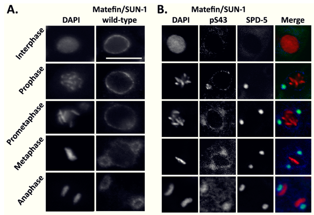 Matefin/SUN-1 is a C. elegans inner nuclear membrane protein that is present only in germ cells and early embryos. Previous studies demonstrated a role for matefin/SUN-1 in germline development, attaching centrosomes to the nucleus and homologous chromosome pairing during meiosis. In this study, we show that the phosphorylated form of the serine 43 in the N-terminal domain of matefin/SUN-1 (S43) is predominantly localized to centrosomes (Figure 1B) where it is phosphorylated in a CDK-1 dependent manner (Figure 2). These results are in agreement with a recent publication showing that three mitotic phosphorylation sites exist in the human SUN1 N-terminal nucleoplasmic domain (S48, S138 and S333), two of which are also phosphorylated by CDK-1 [35].