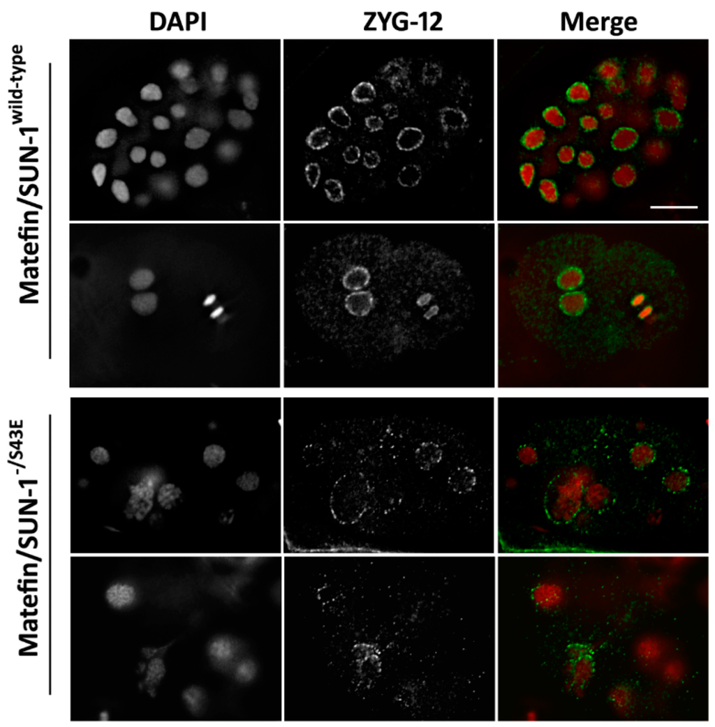 Matefin/SUN-1 pS43 mediates proper NE localization of ZYG- 12. ZYG-12 loses its NE localization in early C. elegans embryos expressing matefin/SUN-1 S43E. Top panels—wild-type matefin/SUN-1 embryos stained with DAPI (red) and anti ZYG-12 antibodies (green); Bottom panels—matefin/SUN-1 S43E embryos stained with DAPI (red) and anti ZYG-12 antibodies (green). Scale bar 10 µm.