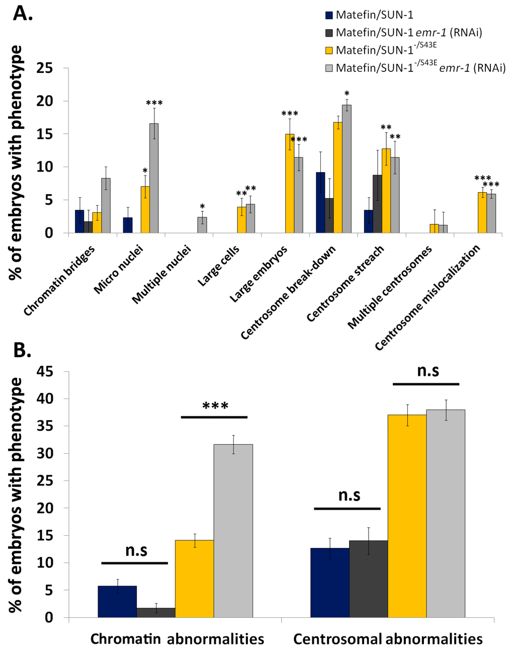 Emerin down regulation increases DNA abnormalities in a matefin/SUN-1 S43E embryos. DNA and centrosome abnormalities were analyzed in emr-1 (RNAi) embryos expressing wild type or S43E matefin/SUN-1. (A) percentage of embryos displaying the phenotypes: chromatin bridges, micro-nuclei (S43E p value = 0.04; S43E emr-1 (RNAi) p value = 8.3 × 10−7), multiple nuclei (S43E emr-1 (RNAi) p value = 0.01), large cells (S43E p value = 0.002; S43E emr-1 (RNAi) p value = 0.0008), large embryos (S43E p value = 1.5 × 10−9; S43E emr-1 (RNAi) p value = 3.1 × 10−8), centrosome break-down (S43E emr-1 (RNAi) p value = 0.01), centrosome stretch (S43E p value = 0.002; S43E emr-1 (RNAi) p value = 0.005), multiple centrosomes and centrosome mislocalization (S43E p value = 0.0002; S43E emr-1 (RNAi) p value = 8.8 × 10−5). P values as compared to wild type; (B) summary of results of chromatin and centrosome abnormalities from (A) the only significant result (p value = 2.9 × 10−5) was observed in S43E emr-1 (RNAi). Error bars represent SEM. * p < 0.0 5, ** p < 0.005, *** p < 0.0005.