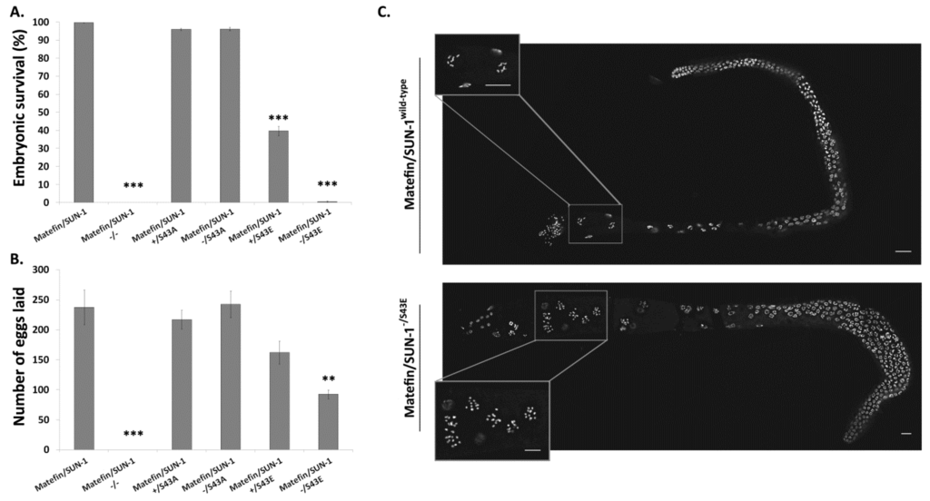 Together, these results suggest that correct S43 phosphorylation of matefin/SUN-1 is required for both the normal progression of meiosis, as well as mitosis during early embryogenesis.