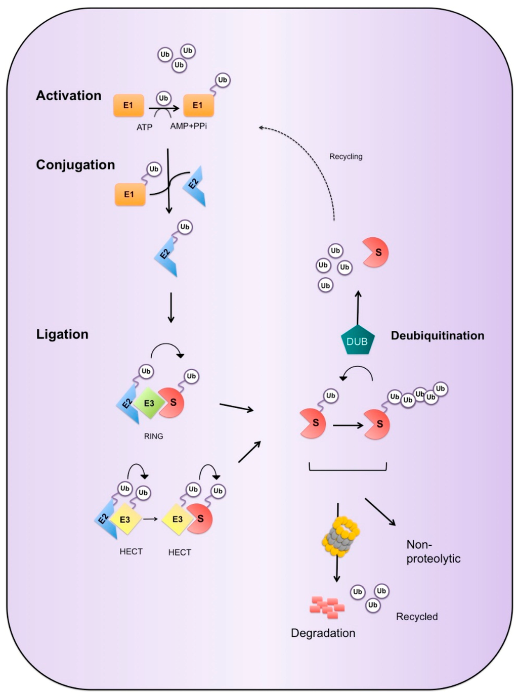 Ubiquitination Cascade. Ubiquitination of a substrate protein (S) occurs via a sequential enzymatic reaction. The initial step involves the ATP-dependent activation of ubiquitin (Ub) by the ubiquitin-activating enzyme (E1) through adenylation of the C-terminal carboxyl group. Once activated, ubiquitin is transferred via a thiolester linkage, to the active site cysteine residue on the E1 with the release of pyrophosphates (PPi) and adenosine monophosphate (AMP). Ubiquitin is next transferred a sulfhydryl group on the ubiquitin-conjugating enzymes (E2) via a transthioesterification reaction. In the final step, a ubiquitin ligase (E3) catalyzes the transfer of ubiquitin to the substrate protein. The two main classes of E3 enzymes are depicted here, HECT (Homologous to the E6-AP C-Terminal domain) and RING (Really Interesting New Gene). Depending on the E3, ubiquitination can occur by direct transfer to the substrate from the E2 or after thioester formation of ubiquitin with the E3. The outcome of the ubiquitinated protein is dependent on type of ubiquitin signal and can involve both proteolytic and non-proteolytic fates. Ubiquitination is also reversible, deubiquiting enzymes (DUB) can hydrolyse the isopeptide bond between ubiquitin and the targeted substrate or the peptide bond between individual ubiquitins to facilitate complete removal or modification of the ubiquitin signal. DUBs are also present in the proteasome, which cleave ubiquitin from its substrate, ubiquitin is then recycled back into the ubiquitin system to maintain a pool of free ubiquitin.
