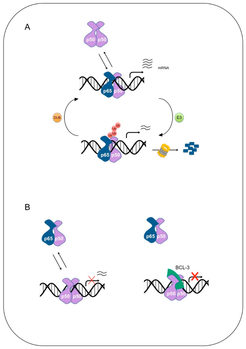 Regulation of NF-κB dependent transcription by ubiquitination. (A) Once liberated from cytoplasmic retention, NF-κB dimers are free to translocate to the nucleus and bind κB sites in the promoter and regulatory regions of NF-κB responsive genes to activate transcription. Promoter occupancy is highly dynamic and NF-κB dimers are in constant competition for binding at these sites. DNA binding triggers the ubiquitination and subsequent degradation of promoter-bound NF-κB allowing the promoter to be reloaded by another NF-κB dimer. Deubiquitases (DUB) oppose the action of the E3 ubiquitin ligase, removing the degradative signal and in turn extending the occupancy time of the dimer; (B) many NF-κB dimers can bind to the same κB sites. As p50 does not contain a transactivation domain, binding of p50 homodimers to κB sites represses the transcription of NF-κB dependent genes. As with p65, DNA binding triggers the ubiquitination of p50 however this can be inhibited by the nuclear IκB protein, BCL-3, extending the occupancy time of inhibitory p50 homodimers.
