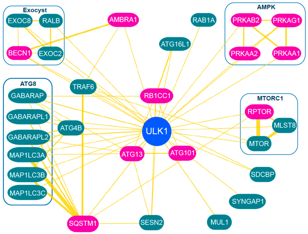 Summary of the ULK1 interactome. A subset of ULK1 protein interactions collated by the BioGRID server was selected for representation. Proteins characterised to also serve as ULK1 substrates are highlighted pink. Thickness of connectors corresponds to numbers of experimental entries supporting interaction. Note: this interaction database does not capture all known ULK1-binding partners including, for example, ATG9, ATG14L1 or FUNDC1.