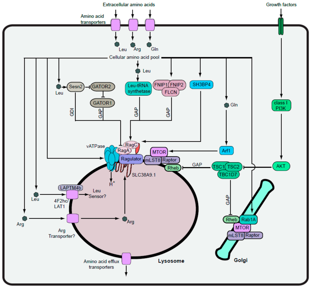 Circuitry of amino acid signalling to MTORC1. Extracellular amino acids are first transported into the cell. Regulatory amino acids such as Leu and Arg are further transported into the lysosome. Lysosomal Arg is sensed via SLC38A9.1, leading to activation of the vATPase-Ragulator complex and MTORC1. Leu is sensed via Sesn2 to regulate the GATOR1 pathway. Gln activates MTORC1 via an Arf1-mediated pathway. Amino acids also activate MTORC1 at the Golgi via Rab1A. Growth factor signalling leads to activation of PI3K and AKT, which controls the TSC1/2 complex and Rheb.