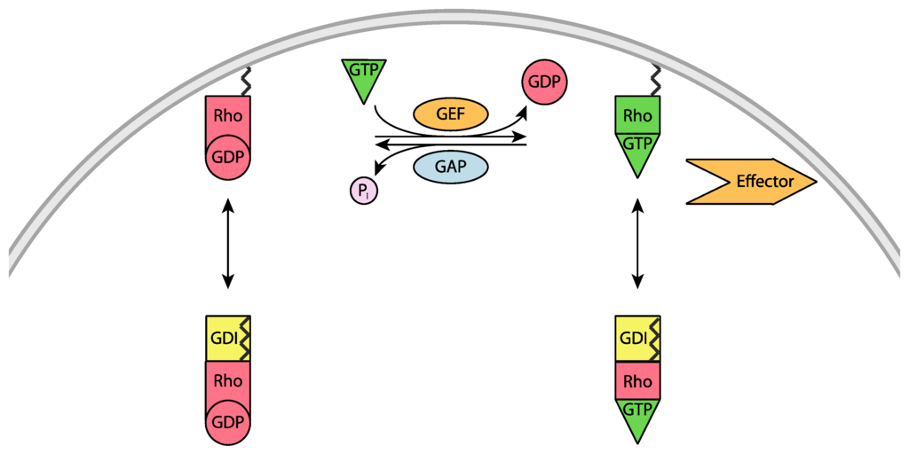 Rho GTPase signaling and the key regulatory proteins. Guanine Exchange Factors (GEFs) activate Rho (green) by mediating the exchange GDP for GTP, while GTPase Activating Proteins (GAPs) promote Rho’s intrinsic GTPase activity, hydrolyzing GTP to GDP and leading to inactivated Rho (red). Guanine Dissociation Inhibitors (GDIs) associate with the covalently bound lipid groups (indicated as jagged black lines) promoting Rho’s dissociation from the membrane. A downstream effectors is coloured orange, and is intended to indicate a range of proteins including ROCKs.