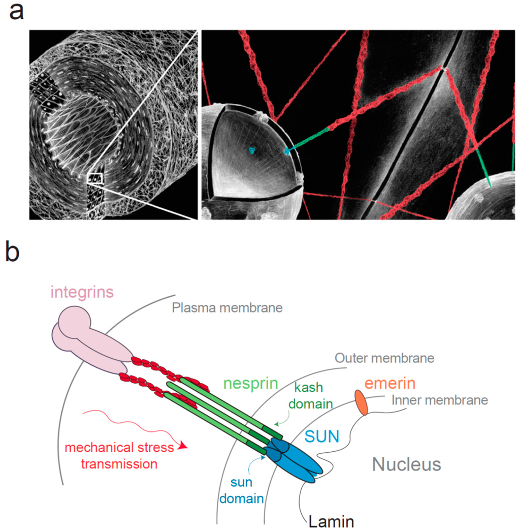 The possibility that mechanical stress can be transmitted from the cell surface to the nucleus was first demonstrated in a seminal work from Donald Ingber’s group []. Using beads coated with integrin ligand and a glass micropipette, they applied tensional forces to the cell surface adhesion of endothelial cells and observed nuclear envelope (NE) distortion. Interestingly, Maniotis and colleagues observed that both actin and intermediate filaments participate to stress transmission. These results indicated for the first time that cell surface integrins were connected with the nucleus [].