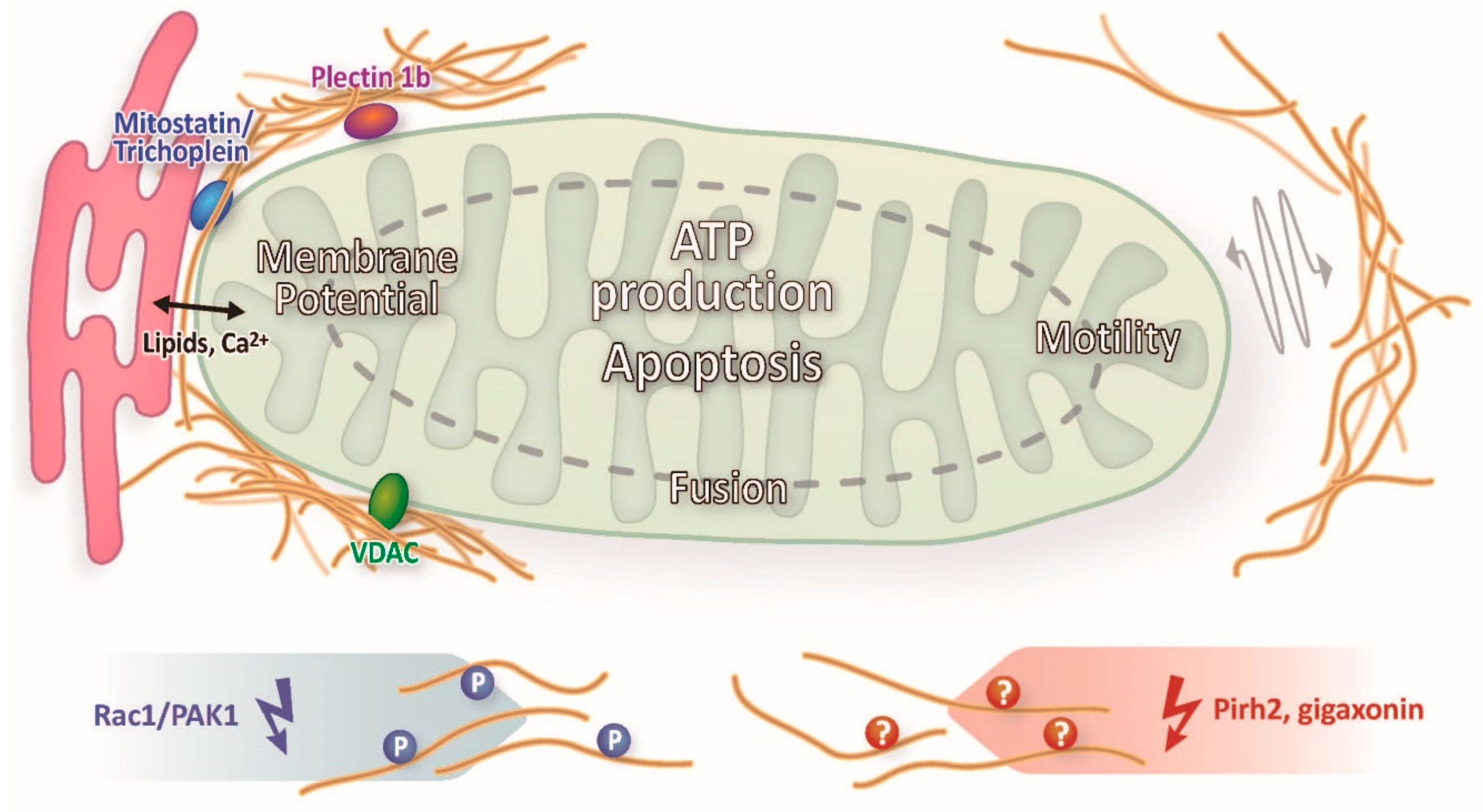Intermediate filaments might either bind directly to mitochondria or via intermediate filament-associated proteins. One of the most likely bridging molecules is plectin, a large cytolinker protein that is ubiquitously expressed [67]. Its isoform 1b was shown to mediate vimentin linkage to mitochondria [68]. Plectin 1b knock-out resulted in mitochondrial shape changes with increased elongation but did not affect mitochondrial motility [69]. The latter shows that only some intermediate filament-dependent mitochondrial functions are mediated through plectin.