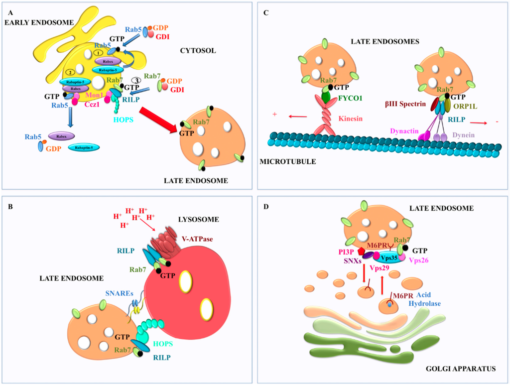 Rab7 in the late endocytic pathway and in retromer regulation: (A) sequential and dynamic cooperation between Rab5 and Rab7 to determine the Rab5 to Rab7 switch; (B) RILP interaction with HOPs complex for late endosome-lysosome fusion and Rab7–RILP interaction to regulate assembly and function of the V-ATPase for acidification; (C) movement of late endosomes on microtubules is determined by interaction of Rab7 with RILP and FYCO1 for minus-end and plus-end direction, respectively; and (D) retrograde transport of transmembrane cargo from endosomes to the TGN is regulated by interaction between Rab7 and subunits of the retromer complex.