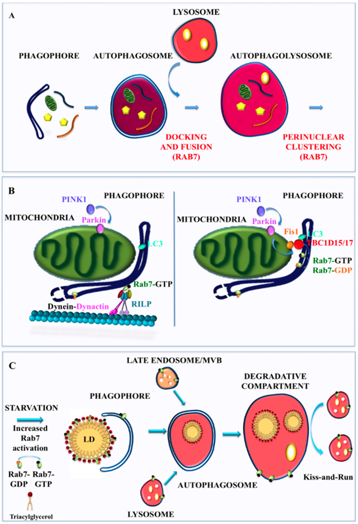 Rab7 in macroautophagy, mitophagy and lipophagy: (A) importance of Rab7 in docking, fusion and autophagosome clustering during macroautophagy; (B) Rab7 promotes the growth of the isolation membrane through microtubule associated trafficking but subsequently Rab7 inactivation is necessary for correct shaping of the autophagosomal membrane around mitochondria; and (C) increased Rab7 activation allows autophagy of LDs, a process named lipophagy. The autophagosome fuses with endocytic Rab7-positive degradative compartments to eventually form an autolysosome for lipid degradation.