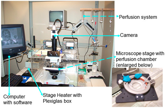 High Speed Digital Imaging Setup for data acquisition. The Motion Analyzer System attached to the microscope (MotionScope 1000 S monochrome, MotionScope PCI High Speed Digital Imaging System from Redlake MASD Inc., San Diego, CA, USA). A ciliated Epithelium specimen is placed in a perfusion chamber (Dvorak-Stotler Controlled Environment Culture System, Nicholson Precision Instruments Inc., Bethesda, MD, USA) attached to a gravity-fed perfusion system which delivers perfusate at the rate of 0.25 mL/min. The chamber is placed under the phase contrast microscope (E. Leitz, Wetzlar, Germany). A Plexiglas enclosure and an air stream stage heater (Nicholson Precision Instruments Inc., Bethesda, MD, USA) maintain the 37 °C temperature of the preparation. A MotionScope high-speed digital camera and PCI application software, running in a Windows environment (Redlake MASD Inc.), is used for image acquisition. A video segment is recorded for each area. Each video segment is stored in a file for later retrieval and analysis (Figure 2).