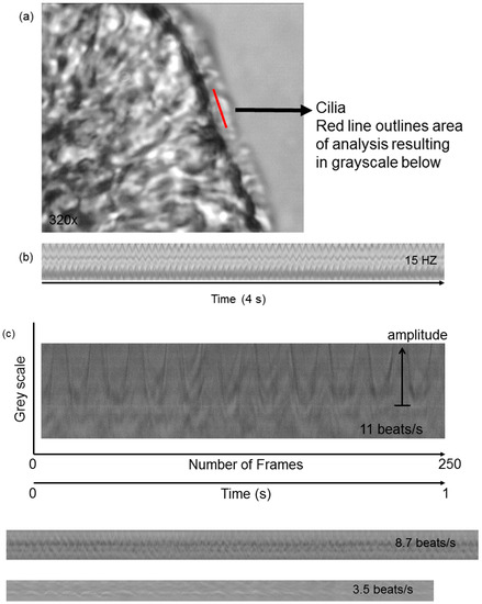 Video analysis and calculation of CBF in a nasal epithelial strip of cells. (a) Cilia are outlined; (b) Grayscale of beating cilia expressed per time and indicating 15 beats/s (i.e., Hz). Magnification 320×; (c) Ciliary beat frequency patterns illustrating amplitude and beat patterns. The video recordings are obtained and analyzed using ProAnalyst video imaging processing software (XCitex, Cambridge, MA, USA). Briefly, areas on the edge of the epithelium with beating cilia are analyzed using the one-dimensional tracking algorithm included in the motion analysis software ProAnalyst. A line is drawn across a segment of cilia (Figure 2a). The software captures the motion history within the analysis grid for the duration of the video and records the gray-scale intensity variation as a function of time (Figure 2b,c). The resulting files are calibrated as pixels/unit. This tracking process allows the plotting of the sinusoidal waveform generated by the beating cilia and the determination of the frequency (Hz). Figure 2c Evaluation of ciliary function (CBF and waveform) shows a 1 s CBF recording of 11 beats/s and CBF waveform panels of 8.7 beats/s and 3.5 beats/s. The resolution of the obtained images at a microscope magnification of 320× and a sampling rate of 250 frames per second is 480 × 420 pixels, where one pixel corresponds to 0.158 μm.