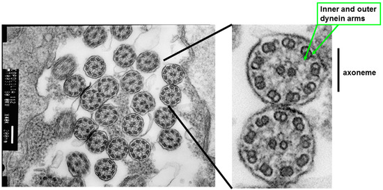 Ultrastructure of airway cilia. An illustration of Transmission Electron Microscopy (TEM) demonstrating axonemes. TEM sections of airway cilia can be analyzed for the number of inner and outer dynein arms, central tubules, and orientation of cilia.