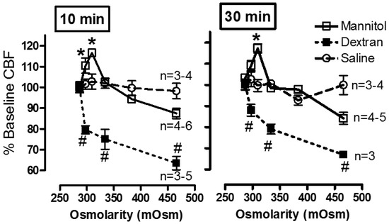 Figure 5. Effect of mannitol, dextran, and saline on CBF of ciliated HBEC. CBF (Hz) was measured from the same sites (10–12 epithelial cell strips) before and after perfusion with mannitol, dextran, or saline for 10 min or 30 min. CBF increased after acute (10 and 30 min) exposure to mannitol and decreased with dextran. No significant change in CBF occurred with hypertonic saline. A fresh batch of HBEC was used per agent. Data shown as % baseline CBF (mean ± SEM). * # ANOVA plus Tukey’s test, p < 0.01 for 10 min; p < 0.05 for 30 min. - Relationship of inflammation to reduced or variable CBF: earlier studies in patients with cystic fibrosis have demonstrated a link between airway inflammation and a reduction in CBF [88,89]. Similar links between inflammation and the impaired mucociliary transport rate were investigated with sputum collected from COPD patients [90], and in ciliated nasal epithelial cells from stable bronchiectatic subjects [91]. However, the effects of inflammation on CBF are not always direct and can reflect modifications of epithelial differentiation and proliferation, possibly related to local chronic inflammation. This occurred in nasal airway cells from Rhinitis patients indicating a possible effect of inflammation on epithelial cell integrity and the number of cilia [92]. In addition, a correlation between ciliary activity and ciliary ultrastructure of the nasal mucosa in chronic and recurrent sinusitis was demonstrated [93] and leukotrienes released during inflammation could slow down CBF [94,95]. Bronchial cilia abnormalities worsened with the disease possibly contributing to the impairment of the mucociliary clearance in chronic bronchitis patients [96]. Also infections such as P. aeruginosa and H. influenzae caused a significant decrease in CBF of human nasal cilia, while staphylococcal products did not [97]. In comparison, RSV infection of human bronchial epithelial cells in culture resulted in ciliostasis and loss of cilia from the cell surface [98]. Resolution of infection and/or inflammation could restore normal cilia function several weeks following upper respiratory viral infection [99] or acute bronchiolitis in infancy [100].