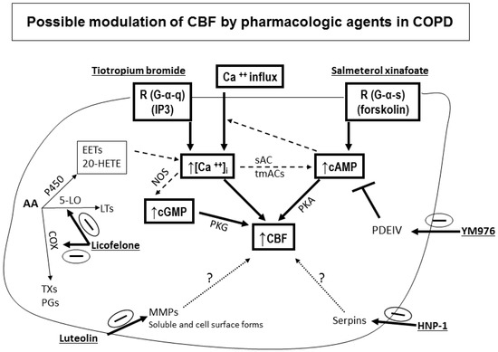 Possible modulation of CBF by pharmacologic agents in COPD. Representative schemes of the possible sites of action of the pharmacologic agents tested on nasal cilia obtained from Control, At Risk, and COPD subjects. Information presented here is derived from the review of signaling pathways involved in mammalian ciliary beating [13], and references in our COPD paper [52] and in this review. Beta agonists cause an immediate cAMP-dependent increase in CBF, followed by a cAMP-dependent increase in intracellular calcium, which in turn increases CBF. Salmeterol (1 µM), a beta-adrenergic agonist, increases CBF in a cAMP-dependent manner via beta two receptors (G-alpha-s coupled R) expressed at the apical membranes of epithelial cells—i.e., acts via increased cAMP, PKA activation, and increased CBF due to phosphorylation of axonemal proteins. Tiotropium Bromide (5 µM) results in muscarinic AchR inhibition (i.e., inhibits muscarinic M3 receptors on parasympathetic postganglionic effector cell junctions) and plays a role in increased intracellular calcium leading to increased CBF; also, increased intracellular calcium activates NOS leading to increased cGMP and increased cGMP-dependent protein kinase and increased CBF. The effect is on a G-alpha-q coupled R and IP3 release which leads to increased calcium influx. Licofelone (10 µM), a dual inhibitor of cyclooxygenase and 5-lipoxygenase pathways—i.e., inhibits 5-LO LTs (LTB4, C4 and D4), prostaglandins, and thromboxanes. Inhibition of both pathways leads to a shift into the metabolism of AA to CYP metabolites (EETs and 20-HETE) which activate influx of calcium into the cell and increased CBF. PKA and PKG activation are also possible. Luteolin (100 µM) inhibits activity of metalloproteinases MMP-2 and MMP-9. MMPs are not expressed in normal healthy tissues but in diseased tissues that are inflamed or undergoing remodeling and repair and MMPs may be compartmentalized in close proximity to the cell surface—i.e., soluble and cell surface forms. YM976 (100 nM) inhibits PDE4 (PDEIV) resulting in increased cAMP and PKA activation and increased CBF. HNP-1 (6 µM), human neutrophil protein-1 inhibits serpins and also acts as an endogenous antimicrobial agent. Note that increased intracellular calcium leads to activation of ca-dependent cyclases (AC1, 3 and 8) which increase cAMP and lead to increased CBF. In summary, whether the agent modulates a receptor (adrenergic/cholinergic), an enzyme (5-LO, COX, PDE4, serpins), or structural components (MMPs soluble and cell surface forms)—i.e., different mechanisms of action—the final outcome is an increased CBF. From the literature, we know that the main second messengers following receptor stimulation are cAMP and calcium and the final step in increased CBF is phosphorylation of axonemal proteins, suggesting a common signaling pathway among all the agents tested. Further investigation of the intracellular signaling pathways is needed. R: receptor; IP3: inositol tris-phosphate; P450: cytochrome P450; 5-LO: 5-lipoxynase; COX: cyclooxygenase; EETs and 20-HETE cytochrome P450 metabolites that result in increased calcium influx into the cell; PDEIV, phosphodiesterase type 4; cAMP, cyclic adenosine monophosphate; cGMP, cyclic guanosine monophosphate; NOS, nitric oxide synthase; PKA, protein kinase A; PKG, cGMP-dependent protein kinase; sAC, soluble adenylyl cyclase; tmACs, transmembrane adenylyl cyclases; Serpins, serine protease inhibitors.