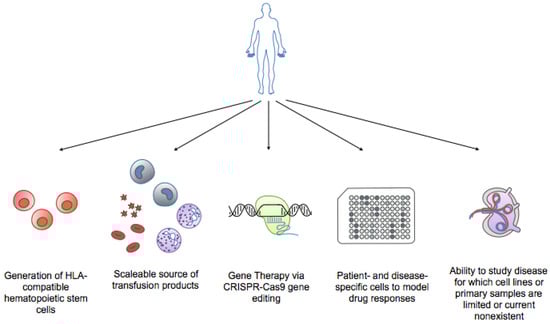 The boost of multiple technologies for iPSC generation during recent years has expanded the feasibility of utilizing iPSCs not only as a research tool but also as an attractive alternative therapeutic approach. The advent of several strategies of genome editing, combined with the possibility of generating patient-specific pluripotent stem cells, is transforming our understanding of the molecular mechanisms underlying genetic diseases and cancers [63]. In particular, great efforts have been directed to the hematology field, leading to significant advances and offering new possibilities for disease modeling, drug development and autologous cell therapy.