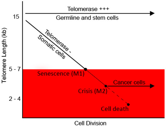 Telomeres protect chromosome integrity and, hence, genome stability to a great extent. Telomeres are deemed dysfunctional if either their telomere length has reached a critical set-off point or the associated shelterin units are delocalised from the telomeres. Telomeres shorten with every cell replication: mitotic cells are consequently more prone to genetic instability as opposed to non-dividing cells. Conceivably, multicellular eukaryotes have evolved mechanisms to signal senescence in mitotic cells upon encountering such stresses. This form of telomere-dependent replicative senescence is characterised by an irreversible exit from cell cycle, resistance to apoptotic signals, and a grossly altered gene expression profile. Telomere shortening, thus, underlies an elegant method adopted by Homo sapiens for maintaining cellular homeostasis and cell turnover (Figure 2). Non-dividing cells undergo telomere-independent senescence upon encountering other kinds of stresses like a sudden mitogenic trigger. Although senescence clearly serves as a barrier for carcinogenesis [52] in exceptional cases, telomere shortening beyond the critical point could predispose cells to acquiring a “mutator phenotype” [121,122].