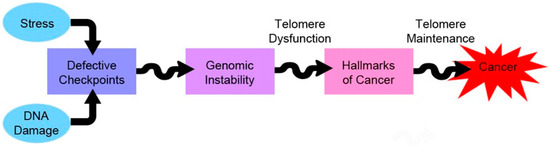 Cells with telomere dysfunction, when left unchecked, can spiral towards a genetically-unstable phenotype by way of chromosomal instability. This precipitates the acquisition of cancer hallmarks, provided the cells are able to regain the ability to maintain their telomeres. Ironically enough, telomere maintenance is necessary for the emerging cancer clones to become full-blown cancers (Figure 3) [133].