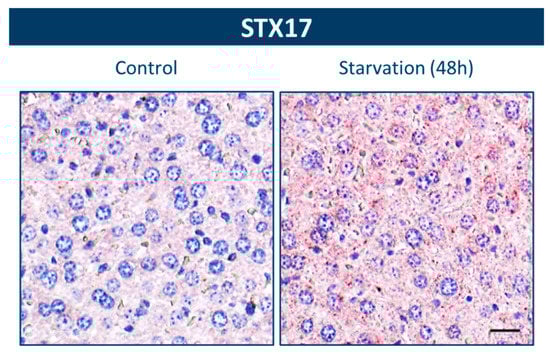 Immunohistochemical detection of STX17 in liver tissue. After fixation in neutral buffered formalin for 24 h, liver samples of wild type mice were paraffin-embedded and stained for STX17 using rabbit polyclonal anti-STX17 (Novus Biologicals, Littleton, CO, USA; NBP1-93968). Heat-mediated antigen retrieval was performed in citrate buffer (pH 6.0). An accumulation of STX17-positive dots is detectable after starvation. Scale bar = 20 μm.