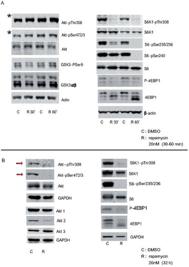 Cortical neurons from mice were treated with rapamycin 3 h after plating, and they were maintained in the presence of rapamycin for short (30 min and 60 min: “A”) or long periods (32 h: “B”), using DMSO alone as a control. Cell extracts were obtained and analysed in Western blots probed with antibodies against some elements of the Akt-mTORC1 pathway, phosphorylated and total proteins such as Akt, S6K1, S6, etc. GAPDH and beta-actin were used as controls of loading. Note that Akt-pSer472/3 is still evident 30 min or 60 min after rapamycin inhibition (asterisk in A), whereas it is almost completely lost after 32 h in the presence of rapamycin (arrows in B).