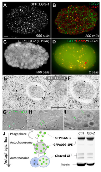 LGG-2 has been less characterized than LGG-1, but GFP::LGG-2 can also be used as an alternative marker to monitor autophagy activity during development, because its localization at phagophores and autophagosomes has been validated by immunoelectron microscopy [25]. Of note, two particular constructs have been generated, GFP::LGG-1(G116A) and GFP::LGG-2(G130A), which inhibit their lipidation and can be used as controls to exclude aggregation artefacts (Figure 1C).