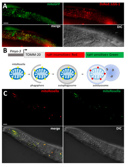 The original method used to identify mitophagy was EM, which has been widely used in yeast, mammalian cells, and C. elegans. The anatomy of mitochondria is very characteristic, and EM analysis is a powerful approach for the identification of phagophores and autophagosomes that are sequestering fragmented mitochondria [87]. However, EM has not been extensively used in C. elegans for characterizing mitophagy in stress conditions, probably because it is time-consuming and costly. As a result, in vivo approaches that are easy to carry out in C. elegans and enable the analysis of numerous samples have been preferred, such as monitoring the co-localization of fragmented mitochondria with autophagosomes marked by fluorescence (Figure 2). Thanks to the genetic tools developed in C. elegans, researchers have generated transgenic worms expressing fluorescence proteins for observation in living animals. For instance, transgenic worms expressing mitochondria-targeted GFP and DsRed::LGG-1 have been used to detect the co-localization of mitochondria and autophagosomes indicating mitophagy events (Figure 2A) [66]. However, the overexpression of DsRed::LGG-1 may form aggregates, and this transgenic strain should be used carefully and with rigorous controls. Alternatively, the tandem fluorescence protein mitoRosella has been developed to monitor in vivo the mitophagic flux (Figure 2B). During the last step of autophagy, the autophagosomes fuse with lysosomes, which allows for the formation of an acidic compartment, the autolysosome, favorable for the degradation of cargoes. MitoRosella is a biosensor containing a fast maturing pH-insensitive DsRed and a pH-sensitive GFP addressed to the mitochondria. Thus, measuring the ratio between GFP and DsRed fluorescences allows researchers to monitor the fusion of mitochondria-containing autophagosomes with lysosomes [66]. Although mitoRosella has been efficiently developed for monitoring the mitophagic flux in the body wall muscle cells (Figure 2C), its heterogeneous level of expression between individual muscle cells may affect the morphology and the homeostasis of the mitochondrial network.