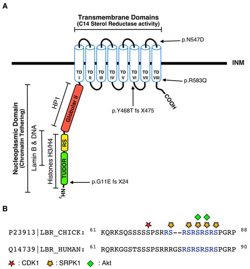 (A) Schematic illustration of full-length LBR. Green, yellow and red boxes correspond to tudor (Met 1 to Phe 60), arginine/serine (RS; Arg 61 to Arg 89) and second globular regions (Pro 90 to Gly 211 in human LBR), respectively, that compose the hydrophilic nucleoplasmic domain, while TDI–TDVIII represent the eight transmembrane domains where the sterol reductase activity of LBR resides. The binding sites for histones H3/H4, DNA, lamin B and HP1 are illustrated. Arrows indicate the positions of the missense mutations R583Q and N547D that result in the production of full-length LBR which lacks sterol reductase activity, and the frame shift mutations p.G11E fs X24 and p.Y468T fs X475 that create premature stop codons in codons 24 and 475, respectively; (B) Alignment of the chicken and human RS domain sequences. Numbers indicate the number of amino acid residues from the N-terminus. Red, yellow and green marks indicate the serine residues in chicken LBR phosphorylated by CDK1, SRPK1 and Akt kinases, respectively.
