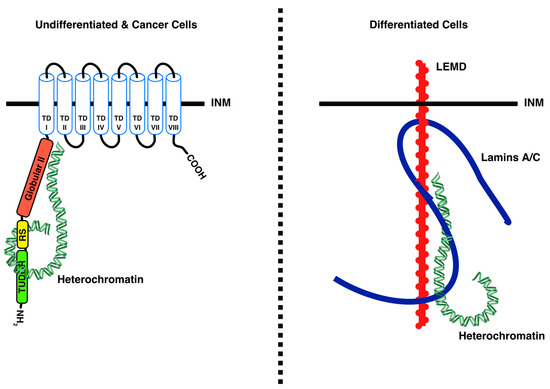 Schematic illustration of heterochromatin tethering to the INM. LBR directly tethers heterochromatin in undifferentiated and cancer cells (left panel), while lamin A/C indirectly tethers heterochromatin in differentiated cells, probably through the LEMD ([LAP2/emerin/MAN1] domain-containing) proteins. From Solovei et al. [4] with permission from Elsevier.