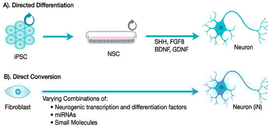 Two basic methods of deriving neurons from somatic cells have been established, directed differentiation and direct conversion []. Directed differentiation involves generation of iPSCs and subsequent derivation into neural stem cells (NSCs), which can then be differentiated into neurons via transcription and growth factors (Figure 1A). Direct conversion converts a somatic cell, such as a fibroblast, directly into a neuron without going through an intermediate pluripotent stage generating iNs (Figure 1B). Both methods can generate neurons that express neuronal markers, neuronal morphological characteristics such as dendrites and axons, and have been shown to be functionally active and able to respond to synaptic stimulation [,]. Directed differentiation has the advantage that the hiPSC-derived NSCs can generate a broad range of neuronal subtypes, such as glutamatergic, dopaminergic, serotonergic or GABAergic neurons, using different transcription factors [,]. For example, the transcription factors Sonic Hedgehog (SHH) and FGF8 direct NSCs toward dopaminergic neurons, while FGF2, SHH, retinoic acid, and activin direct NSCs toward motor neurons, and cortical neurons expressing the neurotransmitter GABA can develop in the absence of specific transcription factors []. In addition, hiPSC-derived NSCs can be induced to differentiate into other neural cells such as astrocytes and oligodendrocytes via addition of other transcription factors. Direct conversion methods, also called lineage conversion or transdifferentiation, can generate neurons more rapidly than directed differentiation (~14 days) and has the potential to produce more pure populations of neurons (up to 90% or greater), thus overcoming some of limitations of directed differentiation []. The rapid derivation of neurons via direct conversion is advantageous for use of patient-specific cells for production of ‘disease in a dish’ neuronal models. A variety of neuronal subtypes, including dopaminergic, glutamatergic, and GABAergic neurons have now been differentiated using direct conversion, although not all neuronal subtypes have been successfully differentiated [].