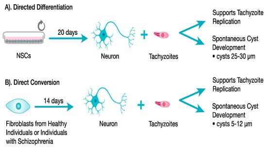 Studies of T. gondii using reprogrammed human neurons. Using a directed differentiation method (A), NSCs were used to derived human neurons in 20 days and then infected with T. gondii tachyzoites. Using a Direct Conversion method (B), starting from fibroblasts derived either from healthy controls or individuals with Schizophrenia, induced human neurons (iNs) were generated in 14 days and then infected with T. gondii tachyzoites. In both human neuronal models, neurons supported tachyzoite replication and bradyzoite replications, which lead to spontaneous cyst development. In fibroblasts for example, typically less than 10% tachyzoite vacuoles spontaneously convert to cysts.