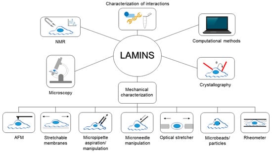 Since their discovery, lamins have been studied exploiting various experimental techniques and procedures from different perspectives; for instance, in recent years, the biomechanical behavior of lamins and their involvement in mechanotransduction has raised great interest in the scientific community. Covering the extremely wide literature in the field is outside the main goal of the present work. Rather, this review aims to collect some interesting examples and highlight the applications of each technique for studying lamins and their role in physiological and pathological conditions. A general overview of the techniques described in this paper is shown in Figure 1. Hopefully, this collection of methodologies will provide readers with a broad foundation of the investigations surrounding lamin and how they can be combined to better understand its properties and role in disease.