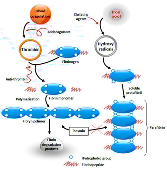 Schematic representation of thrombin-induced blood coagulation (left part) and the conversion of fibrinogen to insoluble polymer under the influence of iron (right part) based on references [,].