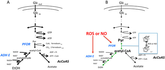 Schematic representation of the glycolytic pathway in E. histolytica. The diagram depicts the pathways that are present under (A) microaerophilic control conditions or (B) after exposure to reactive oxygen species (ROS) or nitric oxide (NO) (in red). The thickness of the arrows represents the relative flux rates through the enzymatic reactions. The size of the metabolite abbreviation represents its relative concentration within the trophozoites. Under stress condition, pyruvate:ferredoxin oxidoreductase (PFOR) and aldehyde/alcohol dehydrogenase (ADHE) (in blue) are inhibited. The metabolic intermediaries before PFOR and ADHE reactions (in green) are accumulated with the concomitant decrease in ethanol (EtOH) and adenosine triphosphate (ATP) production. Glcout, external glucose; Glcin, internal glucose. Adapted from [47].