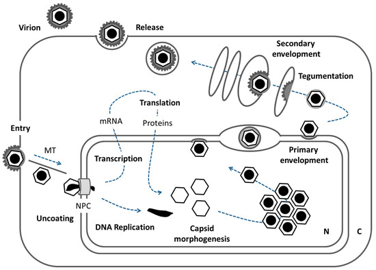 Herpes virions carry a linear double stranded DNA genome, packaged in an icosahedral capsid, which is surrounded by a tegument protein layer, and a host-derived membrane equipped with numerous viral glycoproteins. The herpesviral replication cycle starts upon docking of virions to the host cell followed by entry due to fusion of the virion membrane with the host membrane (Figure 1; [3,4]). Capsids are transported along microtubules (MT) and dock to the cytoplasmic face of the nuclear pore complex (NPC) for uncoating and release of the viral genome into the host nucleus. There, a transcriptional cascade allows for production of viral proteins, furthermore DNA replication of the viral genome proceeds. Morphogenesis of the next generation of herpesviral capsids is initiated in the infected nucleus where a fragile procapsid is packaged with one copy of the viral genome and matured into a stable icosahedral nucleocapsid [5]. In the process of infection, large numbers of nucleocapsids accumulate in replication compartments eventually filling the nucleoplasm and marginalizing the host chromatin [6,7,8], concomitantly, the nuclear lamina is increasingly dissolved [9]. How mature nucleocapsids are released from replication compartments and how they translocate from there to the nuclear envelope is poorly understood [7,10,11,12,13]. In the nuclear periphery, primary envelopment is initiated for vesicular transport of nucleocapsids to the cytoplasm. There, tegumentation and secondary envelopment take place at cytoplasmic membranes resulting in infectious virions released to the extracellular milieu [3,4].