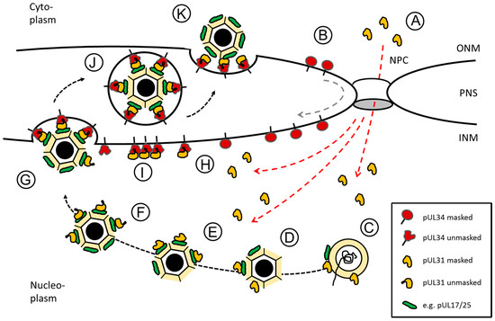 Figure 2. Herpes simplex virus type 1 (HSV1) pUL31-mediated escort of capsids from replication compartments to sites of primary envelopment. Schematic representation of the route, pUL34 and pUL31 take after their synthesis in the cytoplasm until forming the nuclear egress complex (NEC) at the inner nuclear membrane (INM): (A) pUL31 (red dashed lines) and (B) pUL34 (grey dashed line) are imported into the nucleus independent of each other. pUL34 and pUL31 are masked by conformation and/or unknown binding partners to prevent premature NEC formation. (C,D) In the nucleus, pUL31 associates with capsids at the sites of their assembly and potentially assists in genome packaging. (E) pUL31 recognizes surface components of the capsid e.g., pUL17/pUL25 that mark capsid maturation. (F) In presence of the N-terminal domain of pUL31, nucleocapsids are released from replication compartments with pUL31 escorting them to sites of primary envelopment. (G) Capsid-associated pUL31 and pUL34 integral to the INM are unmasked to form heterodimeric NECs that assemble into hexagonal lattices to curve around nucleocapsids until primary envelopment is complete. (H) NECs or (I) NEC seeds preexisting at the INM could contribute to capsid recruitment and envelopment. (J) Primary enveloped nucleocapsids temporarily reside in the perinuclear space (PNS). (K) Fusion of the primary envelope with the outer nuclear membrane (ONM) allows for release of the nucleocapsids to the cytoplasm for secondary envelopment. The nuclear pore complex (NPC), the outer nuclear membrane (ONM) and the inner nuclear membrane (INM) as well as the perinuclear space (PNS) are depicted (modified after [17]).
