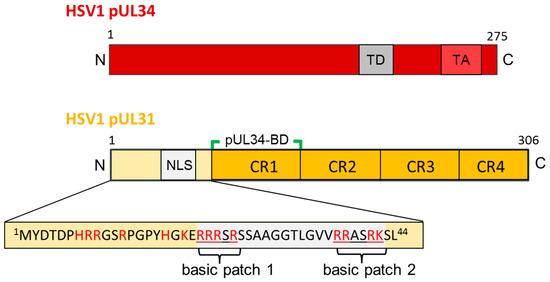 Figure 3. The HSV1 nuclear egress proteins pUL34 and pUL31. Graphical depiction of HSV1 pUL34 and pUL31 and their domain organisation. The amino acid sequence of the N-terminal domain of pUL31 is detailed. N: N-terminus; C: C-terminus; TD: targeting domain; TA: Tail-anchor domain; NLS: nuclear localization sequence; pUL34-BD: pUL34-binding domain; CR: conserved region.