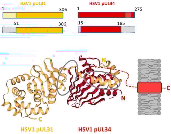 Figure 4. Structure of the HSV1 nuclear egress complex. The structure of the HSV1 pUL31-pUL34 complex is shown as cartoon representation (source: [42]). HSV1 pUL34 and pUL31 and the truncated versions used for the crystals presented are graphically depicted [38]. pUL31 is shown in orange, and pUL34 is shown in red. Interfaces are circled in grey. The inner nuclear membrane (grey) and the tail-anchor domain of pUL34 (light red) are schematically depicted; N: N-terminus; C: C-terminus.