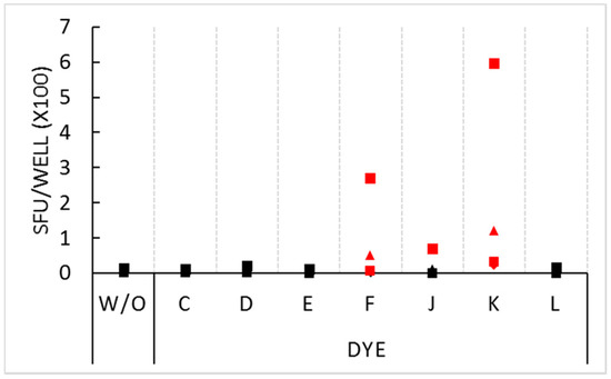 Stimulatory effect of select dyes at 1.5% concentration. PBMC of four donors, distinguished by four symbols, were plated at 3 × 105 cells per well in medium alone (without inclusion of dyes or antigen, W/O), or with the dyes specified on the X axis (also without antigen added). Each condition was tested in three replicate wells with the mean spot count shown on the Y axis. SFU counts that exceeded the threshold for statistical significance (p < 0.01) by the Student’s t-test are represented with red symbols.