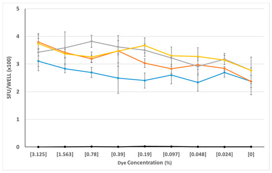 Neutral effect of the four finalist dyes over a wide concentration range. PBMC of a CEF-7 reactive donor were tested in an IFN-γ ELISPOT assay for CEF-7—induced production of the cytokine vs. spot formation in the medium control. The test was done in the absence of added dye (0% dye concentration), or in the presence of the specified concentrations of dyes C, D, E, and L, distinguished by colors. (The grey line is dye C, dye E is in yellow, dye D is orange, and dye L is represented by the blue line.) SFU counts in all medium control wells—in the presence or absence of dye—were less than 10/well and are seen as the black symbols overlaying the X axis. The data shown have been obtained from a single donor, and is representative of three additional donors tested.
