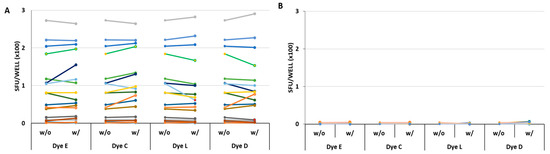 Verifying the four finalist dyes’ lack of inhibitory or stimulatory effect. (A) The CMVgr2 antigen response in PBMC from 17 donors. The PBMC of 17 donors are distinguished by colors. The PBMC were tested in the absence (w/o) or in the presence (w/) of the specified dyes present at 0.39%, 0.39%, 0.09% and 1.56% for dyes C, D, E, and L, respectively. The corresponding SFU counts, representing means of triplicate wells, are connected by a line. None of these data pairs reached statistically significant difference: the p-values for comparing the donor groups tested with or without dyes were 0.89, 0.82, 0.87 and 0.96 for dyes E, C, L and D respectively; (B) The medium control results for all 17 donors in the presence or absence of the four dyes. No statistically significant differences were seen: the p-values for comparing the donor groups tested with or without dyes were 0.43, 0.22, 0.05 and 0.07 for dyes E, C, L and D respectively.