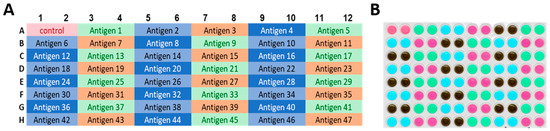 Visual quality control for plating of antigen. (A) The plate layout for an experiment is shown in which 47 antigens are to be tested on a plate, each in duplicate wells. The four selected reagent tracker dyes have been assigned to the antigens in a revolving order, as shown by the four background colors assigned to the data fields. Wells A1 and A2 are the negative controls, with cells in phenol red containing medium only, without antigen/RT dye added; (B) A back-lit photograph of the ELISPOT plate is shown after the RT-dye-labelled antigens have been plated. The finalist dye concentrations were used, 0.39%, 0.39%, 0.09% and 1.56% for dyes C, D, E, and L, respectively in phenol red free medium.