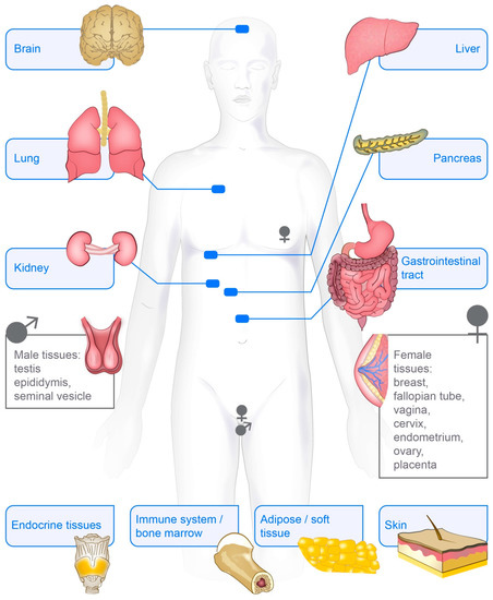 Example of tissue groups in which vimentin protein has been identified in low, medium or high levels. Gender-neutral and gender-specific tissue groups are indicated by blue or white squares, respectively.