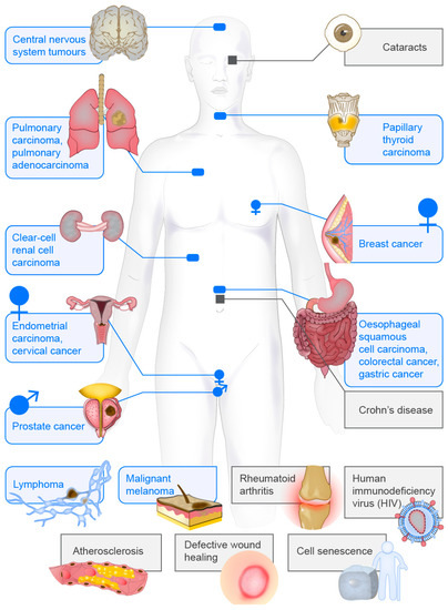 Vimentin has been linked to a large number of pathological conditions, such as neoplasms, eye diseases, endocrine system diseases, fibrosis-related diseases, heart or vascular diseases, reproductive system diseases, infectious diseases, skin diseases, skeletal system diseases, diabetes, and inflammatory bowel diseases. Below, we briefly summarise the major findings in the studies that have investigated the role of vimentin in disease, across a selection of the best-studied diseases.