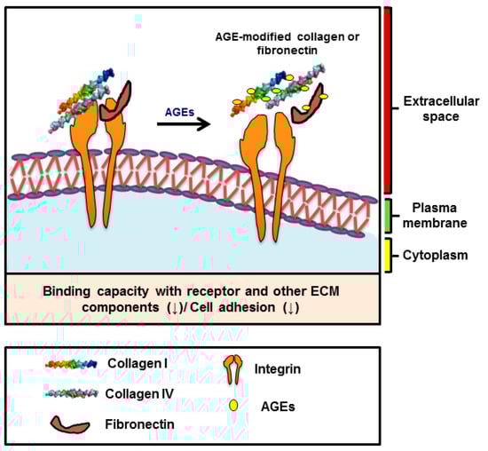 The nonenzymatic binding of a glucose molecule to proteins, lipids, or nucleic acids yields stable ‘Amadori products’, which undergo additional modifications to form advanced glycation end products (AGEs). AGEs are chemically heterogeneously modified molecules that form through the nonenzymatic glycation of proteins over an individual’s lifetime and have been implicated in a number of chronic diseases, such as diabetes []. Elevated levels of AGEs have been directly related to degrees of hyperglycemia, which underlies tissue damage and T2DM []. The formation of AGEs in diabetic patients is enhanced by high glucose concentrations in blood and is ‘impulsive’ and rather slow and predominantly affects proteins with comparatively long half-lives with exposed ‘lysine’ residues. The ECM proteins are usually long-lived and are latent targets of nonenzymatic glycation. Moreover, among the ECM proteins, collagens are highly vulnerable to glycation. Fibrillar collagens have exceptionally long half-lives, for example, type I collagen has half-lives of 1–2 years in bone and 10–15 years in skin, and type II collagen has a half-life exceeding 100 years in cartilage []. The glycation of fibrillar collagen is a surface phenomenon that produces cross-linkages, which subsequently modify matrix properties. The glycation of the ECM proteins causes structural alterations and disrupts binding affinities because it modifies the arginine residues of RGD and GFOGER motifs of major ECM components like FN and collagens. Furthermore, the intramolecular cross-links formed may confer proteolytic resistance, eventually leading to basement membrane coagulation []. In addition, AGE-mediated alterations in collagens I and IV affect the intensities of their interactions (binding capacity) with other components of the ECM as well as their capability to support cell adhesion. The interactions among the ECM components, such as collagen I and/or IV, FN, and heparin were found to be reduced by AGE-modification (Figure 2) [,,].