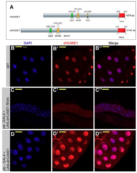 Since Myc proteins are key substrates of HUWE1 in vertebrates, we began by characterizing the expression pattern and effects of modulating dHUWE1 expression in the third instar larvae salivary gland. As Figure 1B–B” shows, endogenous dHUWE1 protein is highly expressed in the nuclei of salivary gland cells. Next, we tested the impact of dHUWE1 over-expression on salivary gland morphology using an inserted p-element containing a UAS-activating sequence located 500 pb upstream to the transcription start site. This UAS insertion enables the conditional expression of the full-length endogenous dHUWE1 protein under the control of specific GAL4 lines [40]. We also used a dHUWE1-specifc UAS-transgenic RNAi (VDRC #26935) to deplete dHUWE1 (Supplementary Figure S2). We used either ptc-Gal4 or hey-Gal4 to direct the expression of these transgenic lines to the salivary gland cells [41], which gave similar results.